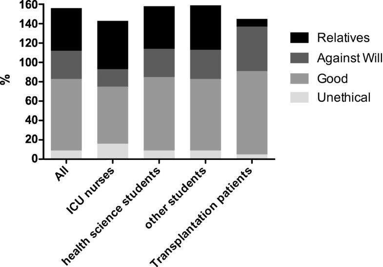 An online survey among 3 target groups (ICU nurses, health science students and non health science students) was performed and results were compared to the answers from transplantation patients to a paper questionnaire. A total of 8415 persons were asked to participate in the survey and 2025 (24%) persons correctly completed the questionnaire. 1945 online responses (ICU nurses n = 185; students of health sciences n = 1277; students of non-health science related courses n = 483) were analysed and data were compared to 80 manually filled-in responses from patients from a previous study.